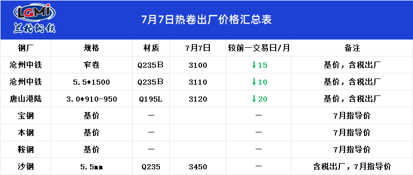 • 7月7日热卷出厂价格汇总