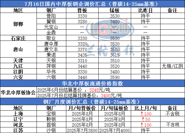 • 7月16日国内中厚板钢企调价汇总