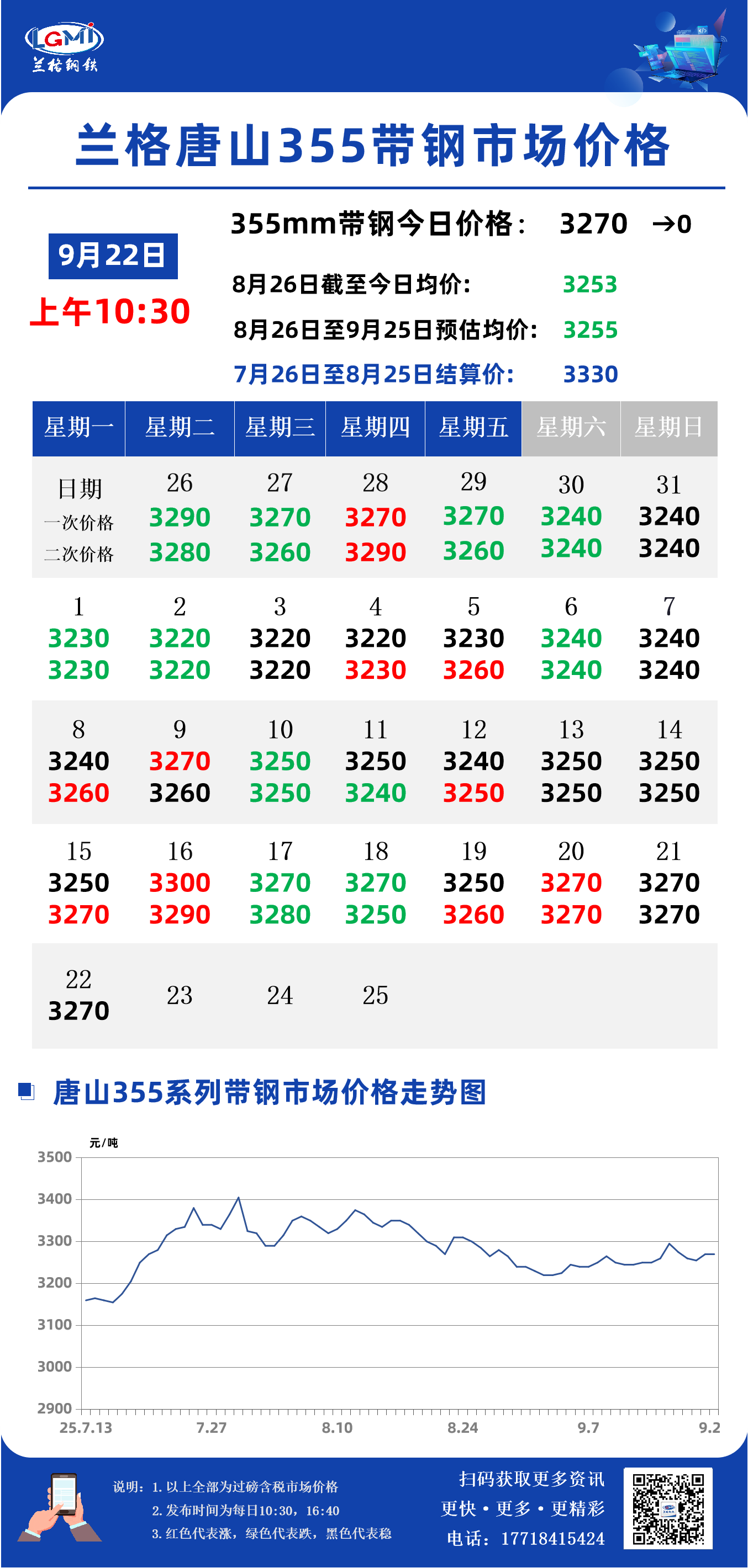 据兰格钢铁云商平台监测数据显示,截至9月22日10:30,唐山地区355系列带钢市场价格为3270元,较昨日市场收盘价格稳。