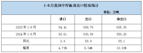 据海关统计数据显示,1-8月国内中厚板累计进口量84.41万吨,同比增加3.80万吨;1-8月我国共出口中厚板总量689.79万吨,同比增加58.90万吨。同期,中厚板净出口量605.38万吨,同比增加55.10万吨。