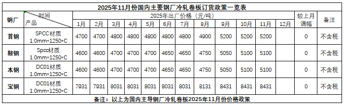 • 2025年11月份国内主要钢厂冷轧板卷订货政策