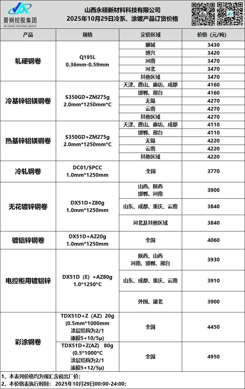 • 10月29日山西晋钢冷系 涂镀订货价格