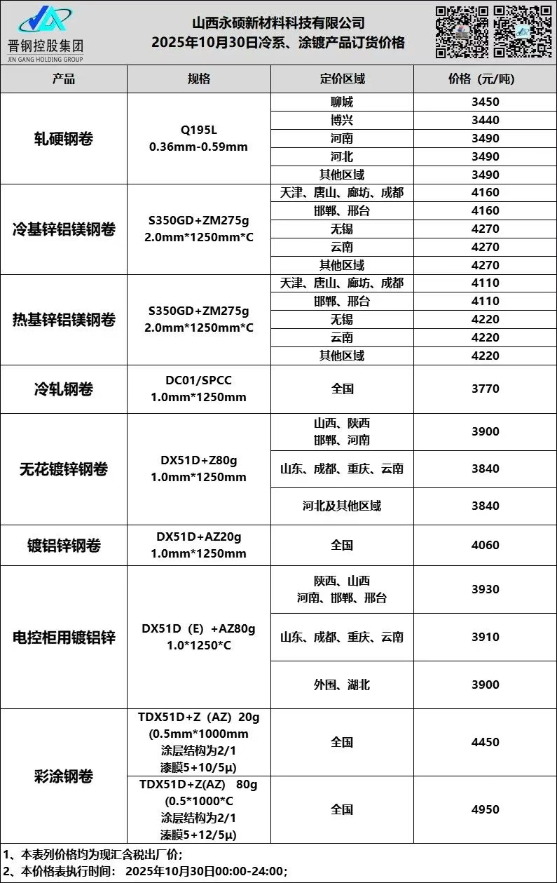 • 10月30日山西晋钢冷系 涂镀订货价格