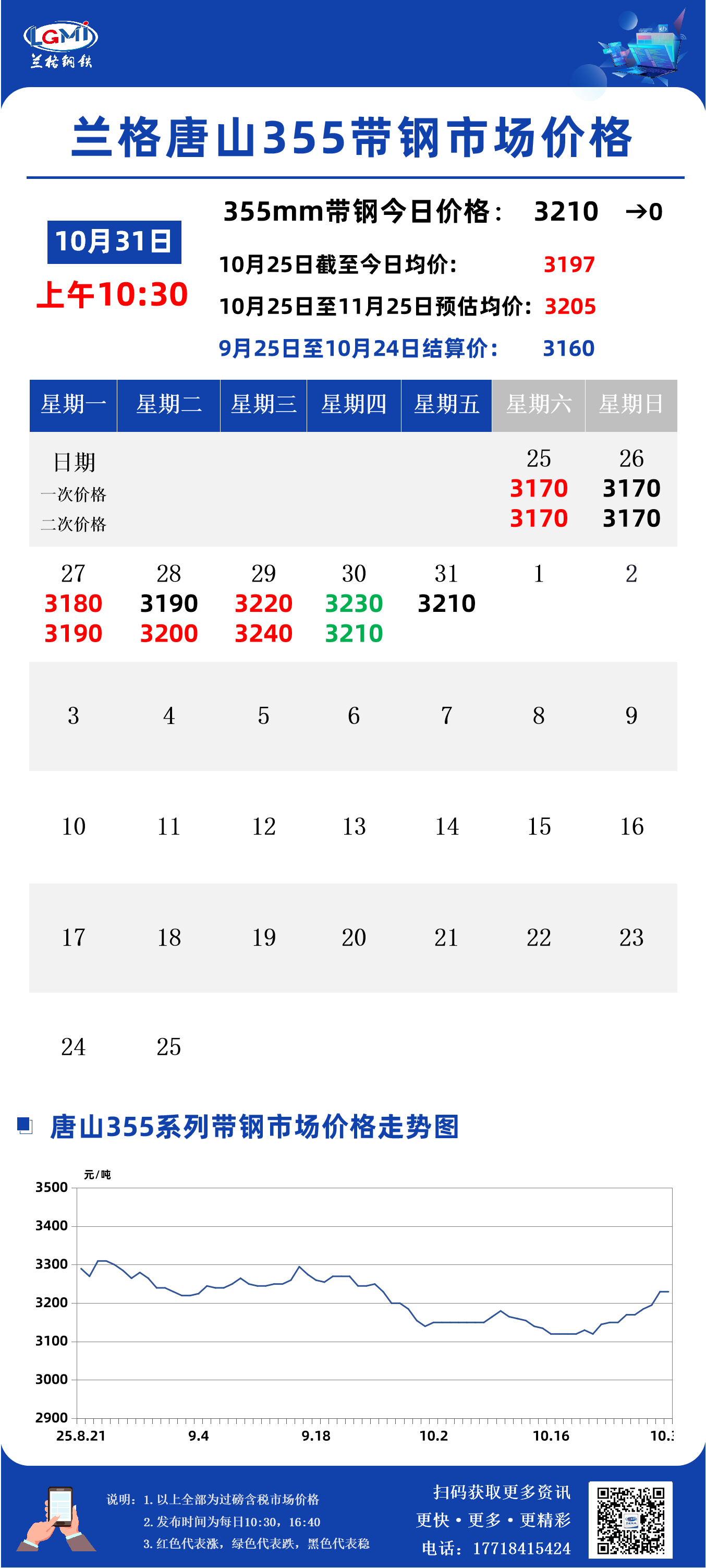 据兰格钢铁云商平台监测数据显示,截至10月31日10:30,唐山地区355系列带钢市场价格为3210元,较昨日市场收盘价格稳。