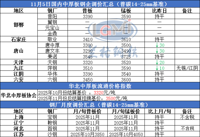 2025年11月5日国内中厚板钢企调价汇总