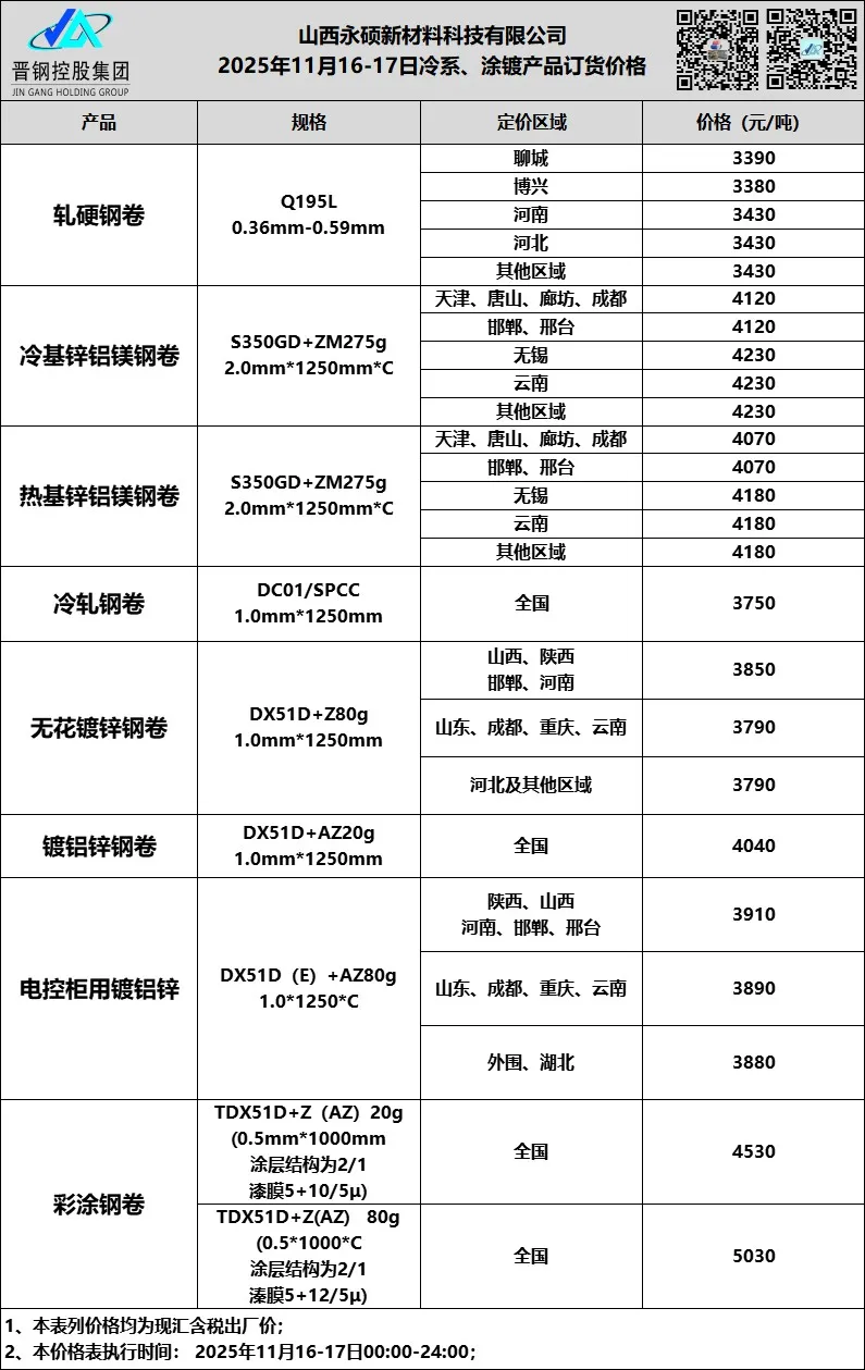 • 11月17日山西晋钢冷系 涂镀订货价格
