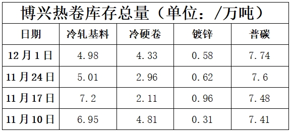 据兰格云商平台监测数据显示,截止12月1日博兴各仓库冷轧基料库存约为4.98万吨,较上期减少0.03万吨;冷硬卷库存4.33万吨,较上期增加1.37万吨。