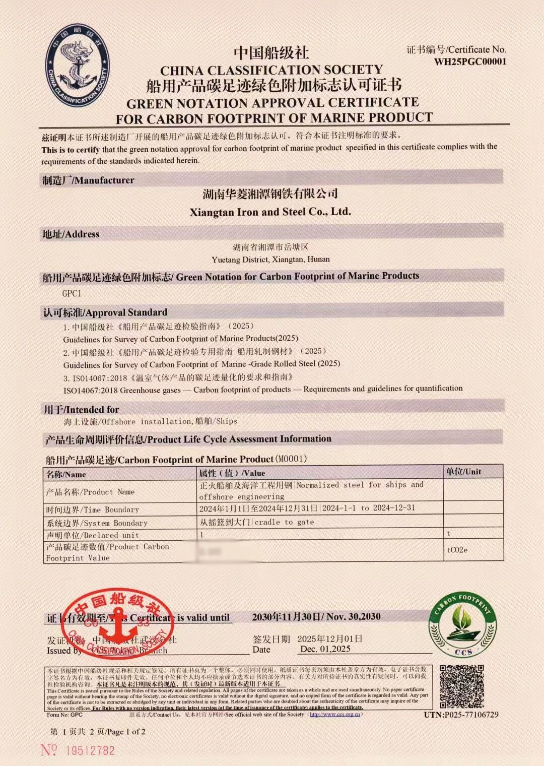 获得这一认证,证明湘钢船用产品在整个生命周期内的碳足迹已满足特定标准,为船舶工业绿色供应链建设提供了示范。