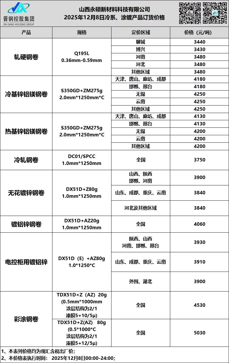 • 12月8日山西晋钢冷系 涂镀订货价格