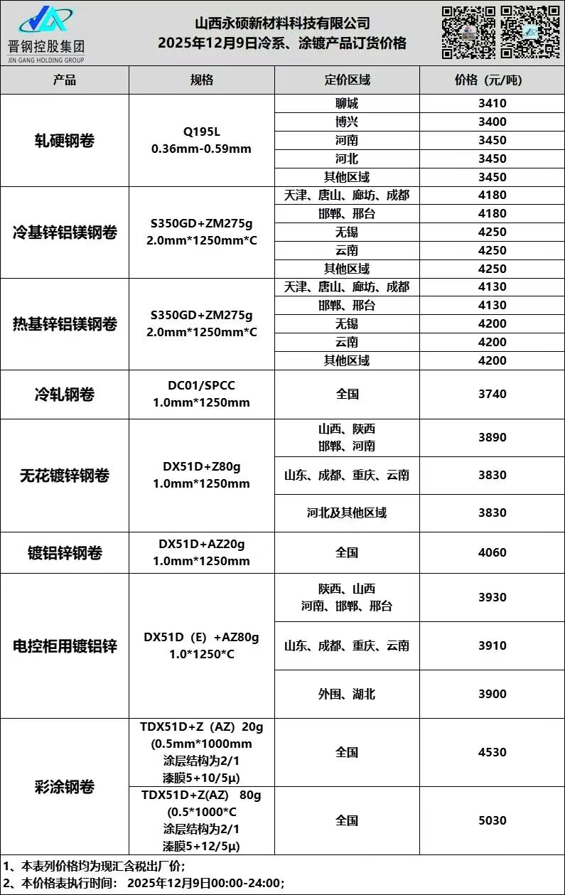 • 12月9日山西晋钢冷系 涂镀订货价格