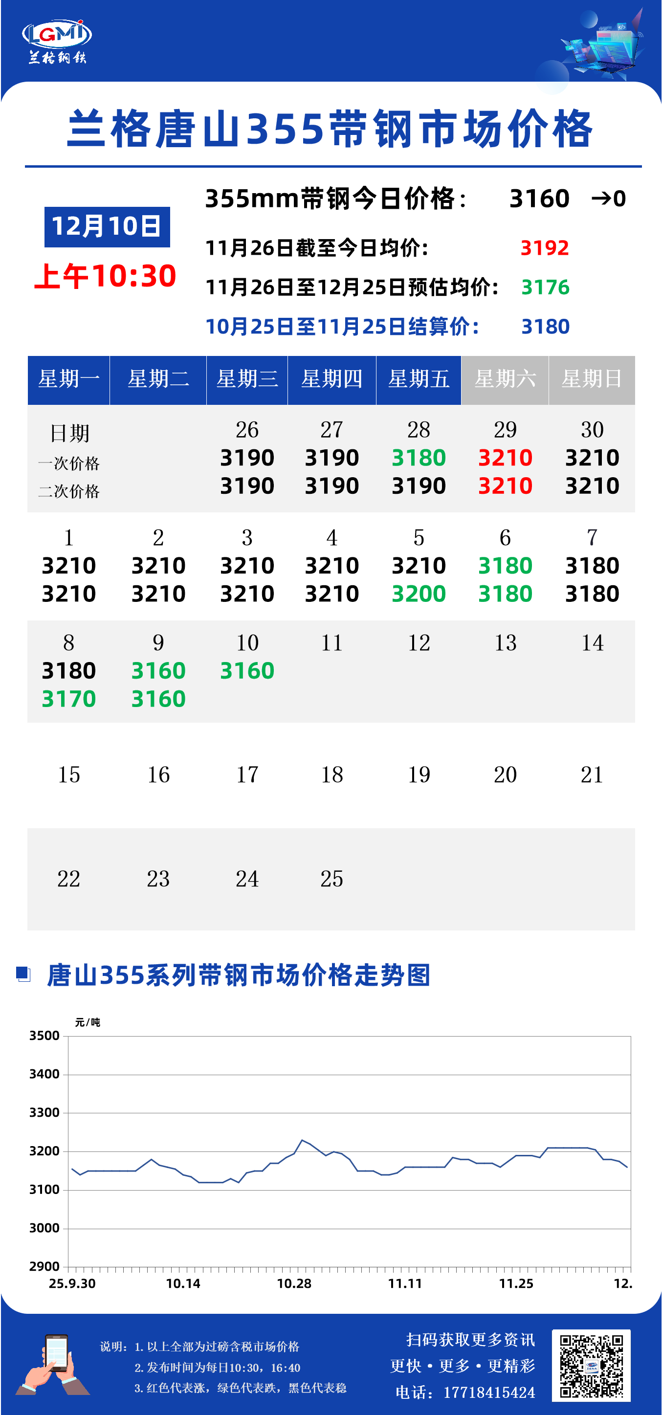 据兰格钢铁云商平台监测数据显示,截至12月10日10:30,唐山地区355系列带钢市场价格为3160元,较昨日市场收盘价格跌10元。