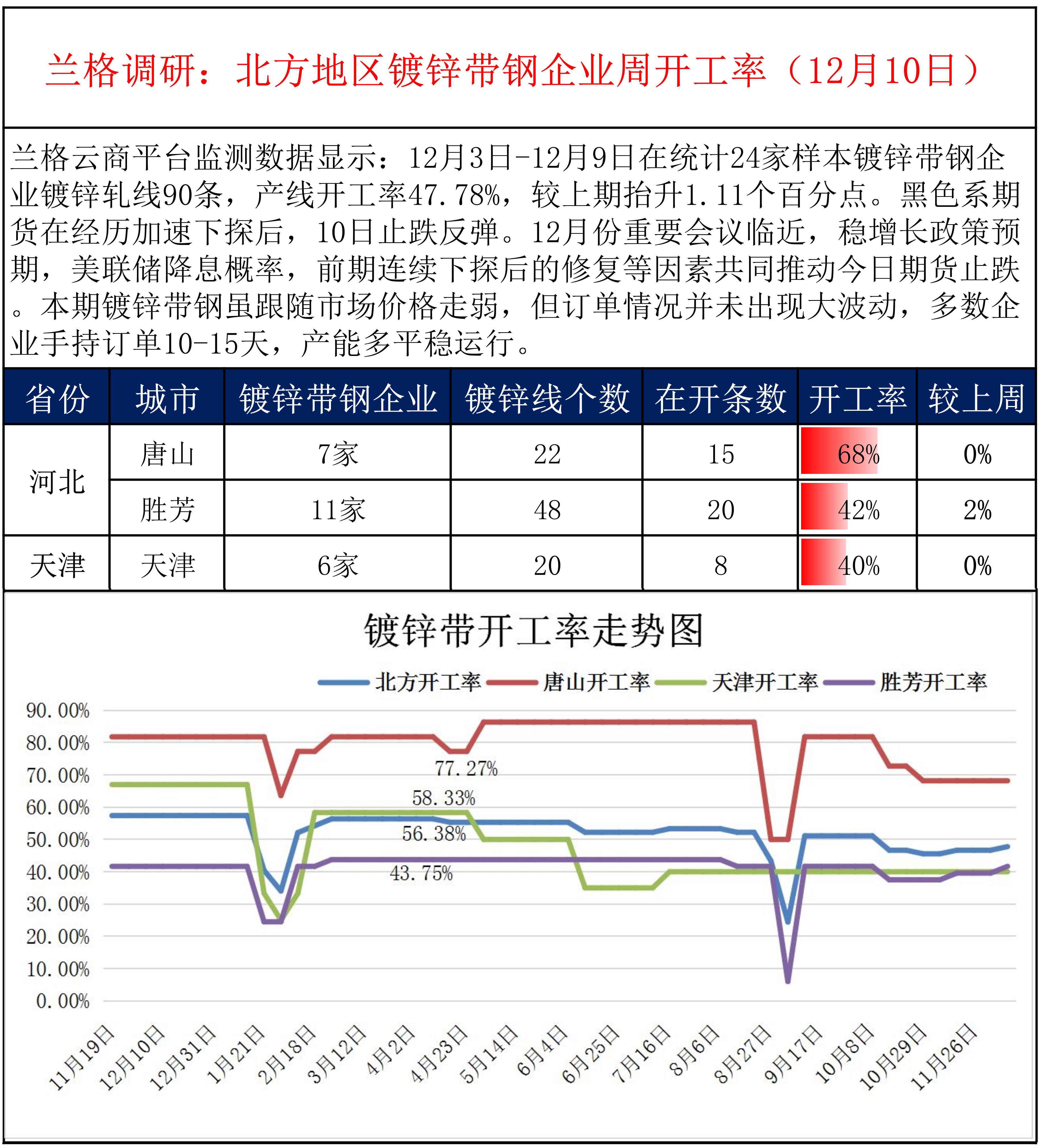 • 兰格调研:北方地区镀锌带钢企业周开工率(12月10日)