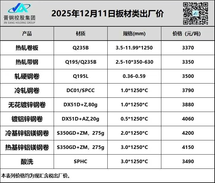 12月11日山西晋钢板材类出厂价格