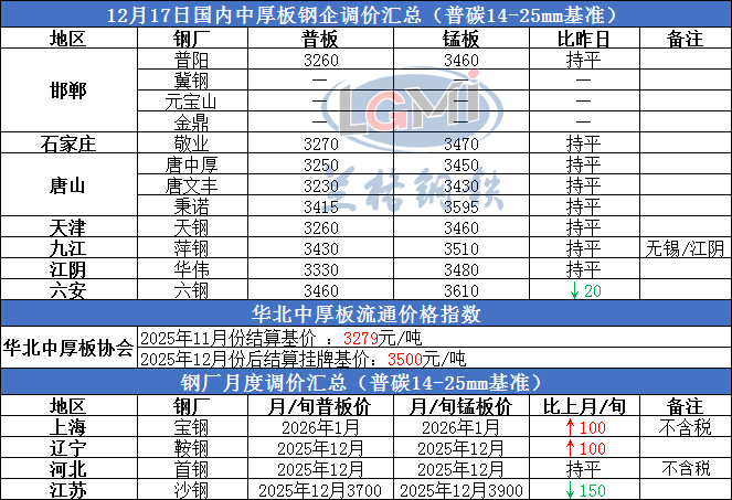 • 2025年12月17日国内中厚板钢企调价汇总