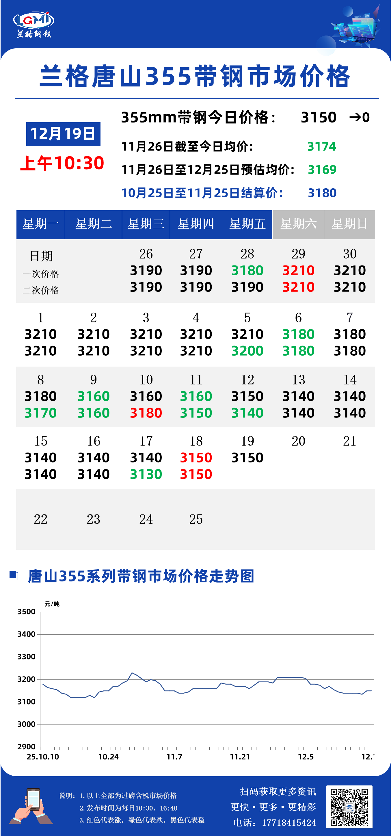据兰格钢铁云商平台监测数据显示,截至12月19日10:30,唐山地区355系列带钢市场价格为3150元,较昨日市场收盘价格稳。