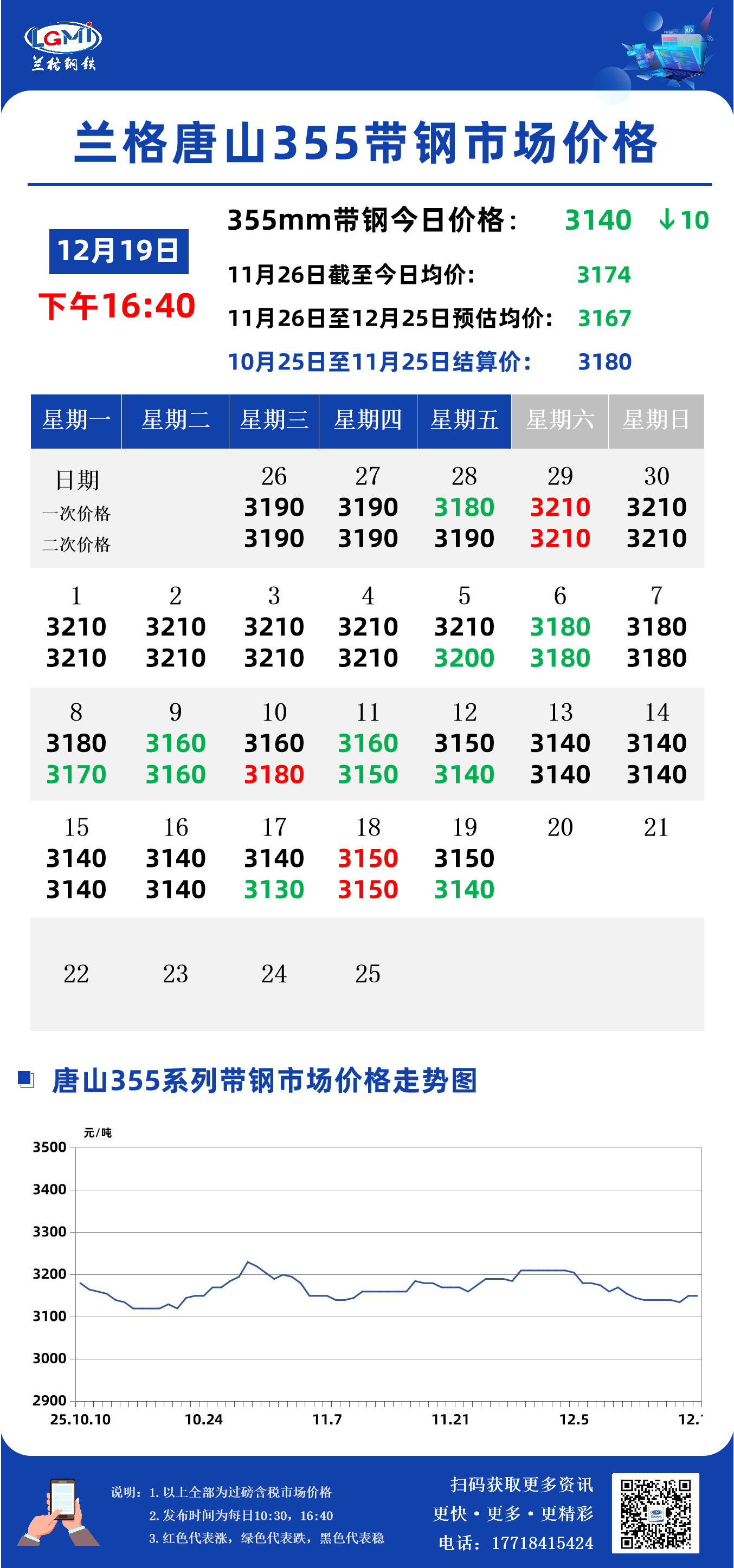 据兰格钢铁云商平台监测数据显示,截至12月19日16:40,唐山地区355系列带钢市场价格为3140元,较昨日市场收盘价格跌10元。