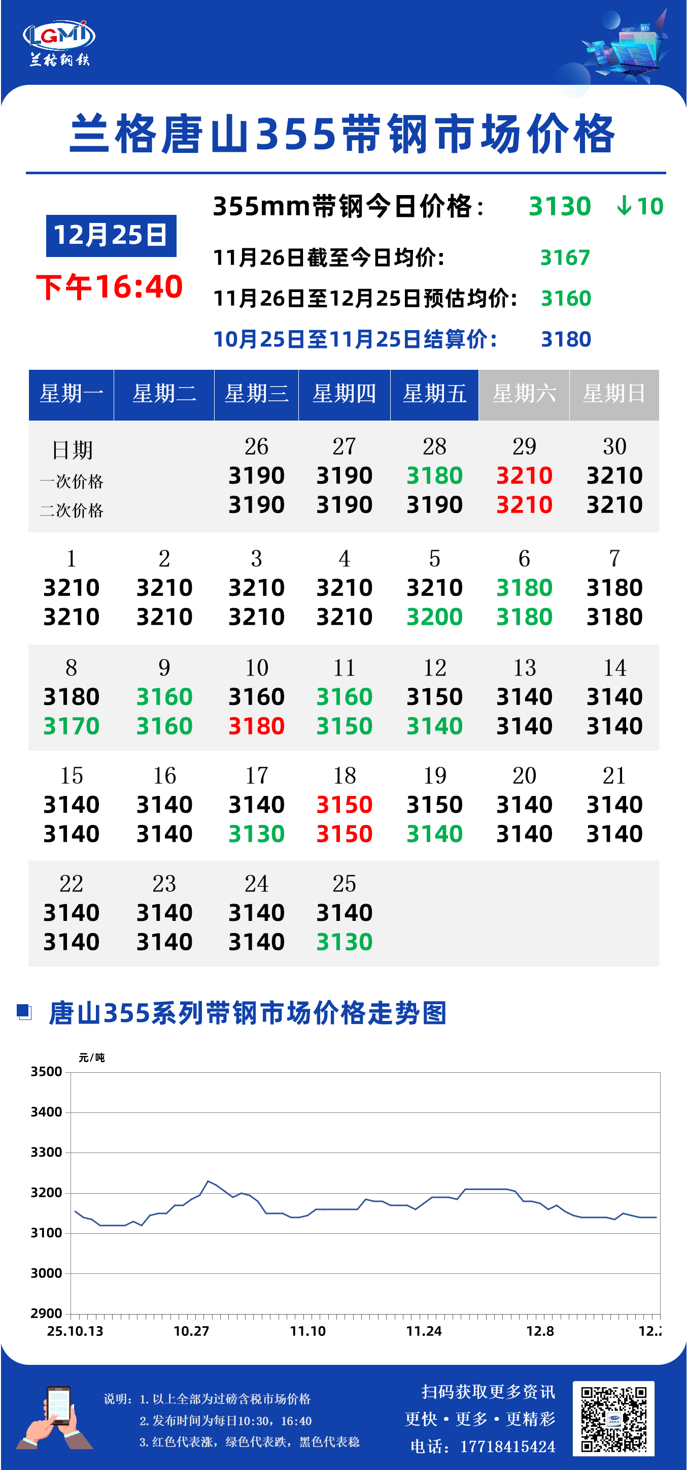 据兰格钢铁云商平台监测数据显示,截至12月25日16:40,唐山地区355系列带钢市场价格为3130元,较昨日市场收盘价格跌10元。