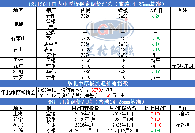 • 2025年12月26日国内中厚板钢企调价汇总