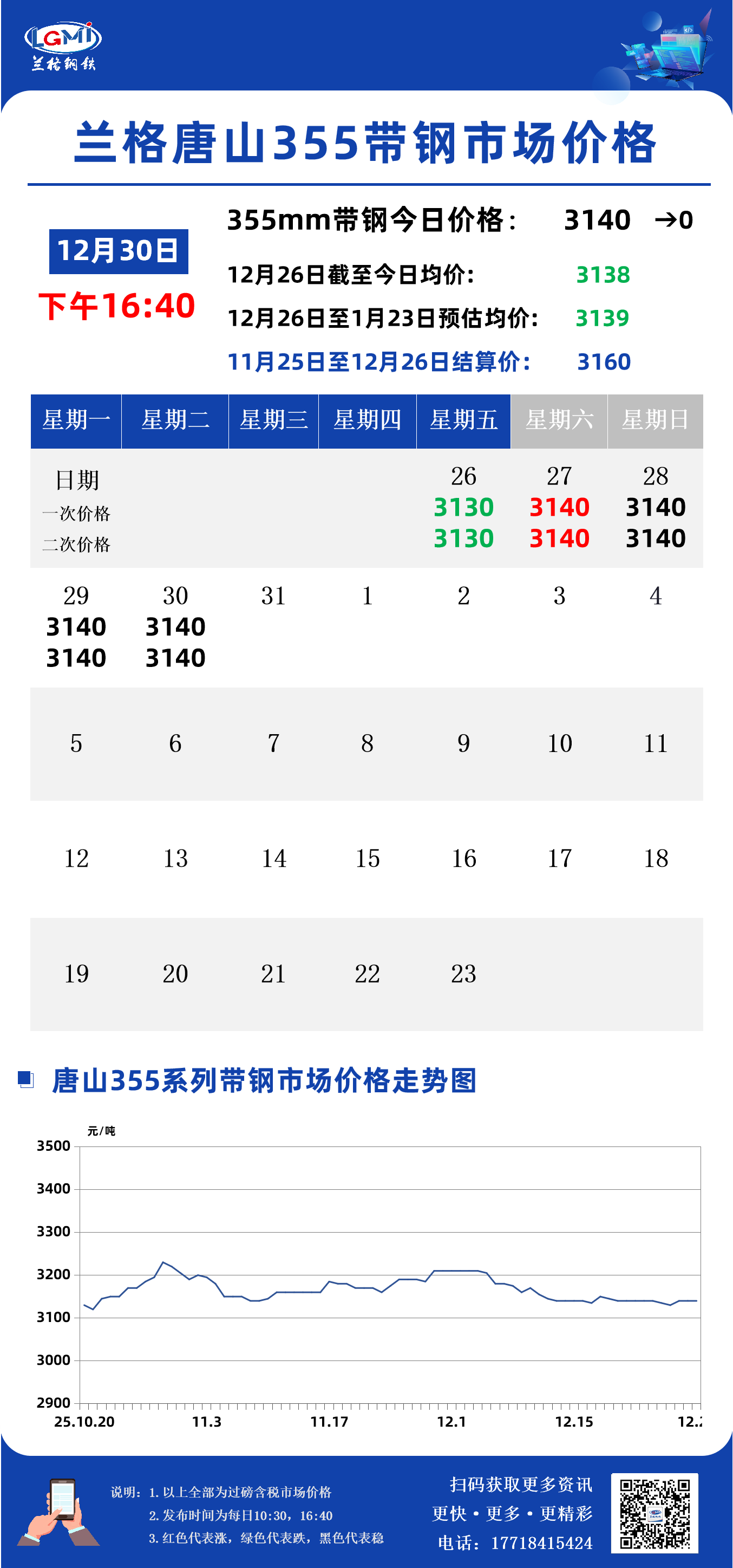 据兰格钢铁云商平台监测数据显示,截至12月30日16:40,唐山地区355系列带钢市场价格为3140元,较昨日市场收盘价格稳。