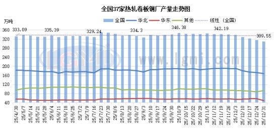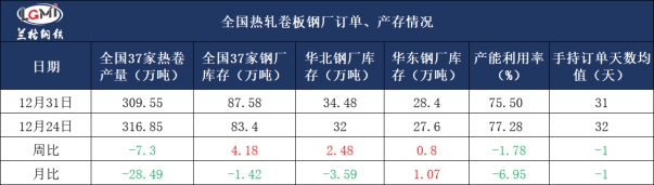截止12月31日,兰格钢铁网监测的全国热卷钢厂主要指标显示,国内热卷总产量连续第六周下降,钢厂厂内库存量有所回升。追踪国内37家热卷企业本周热卷总产量约309.55万吨,较上周同期减少7.3万吨;热卷轧线产能利用率75.50%,较上周下降1.78个百分点;样本钢厂库存量约为87.58万吨,较上周增加4.18万吨。 目前手持订单情况总体表现为良,长协订单31天,较上周下降1天:一线企业手持订单天数保持在30天左右,二线企业基本保持在15-25天。(指标评价-良)。 注:评价指标,仅代表兰格根据关联指标给出的市场晴雨表推荐参考,分优、良、一般、低,四个档位。