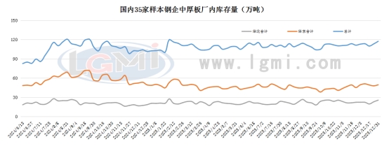 12月31日,全国中厚板35家样本钢厂库存总量为117.46万吨(44家新样本钢厂库存总量为126.7万吨),环比上周同期增加4万吨,其中华北12家钢企中厚板厂库为25.68万吨,环比上期增加2.57万吨;华东12家钢企中厚板厂库为49.58万吨,环比上周同期增加1.53万吨。从数据来看,中厚板钢厂库存量已连续三周呈现增长趋势,且增幅速度相比前期有所扩张,尤其是华北、华东地区作为中厚板的主要产销区域,厂库均呈现增加态势,显示市场消化压力持续存在,此外,其他区域如西北、西南等地钢厂库存也有不同程度的小幅上升,整体库存压力进一步向钢厂端集中。