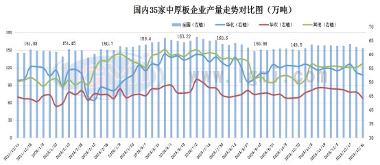 12月31日,全国中厚板35家样本企业周产量为153.45万吨(44家新样本钢厂周产量为197.6万吨),环比上周同期减少2.28万吨,轧线产能利用率为84.99%,环比上期下浮1.26个百分点,截止目前样本钢厂19条轧线未满产,8条轧线处于停产状态。从数据可见,尽管本周全国中厚板产量环比有所下降,但钢厂整体生产力度并未出现显著收缩,尤其是华中区域个别钢厂结束设备检修期,轧线产能处于稳步回升局面,间接抵消了其他区域因检修或限产带来的产量下滑。
