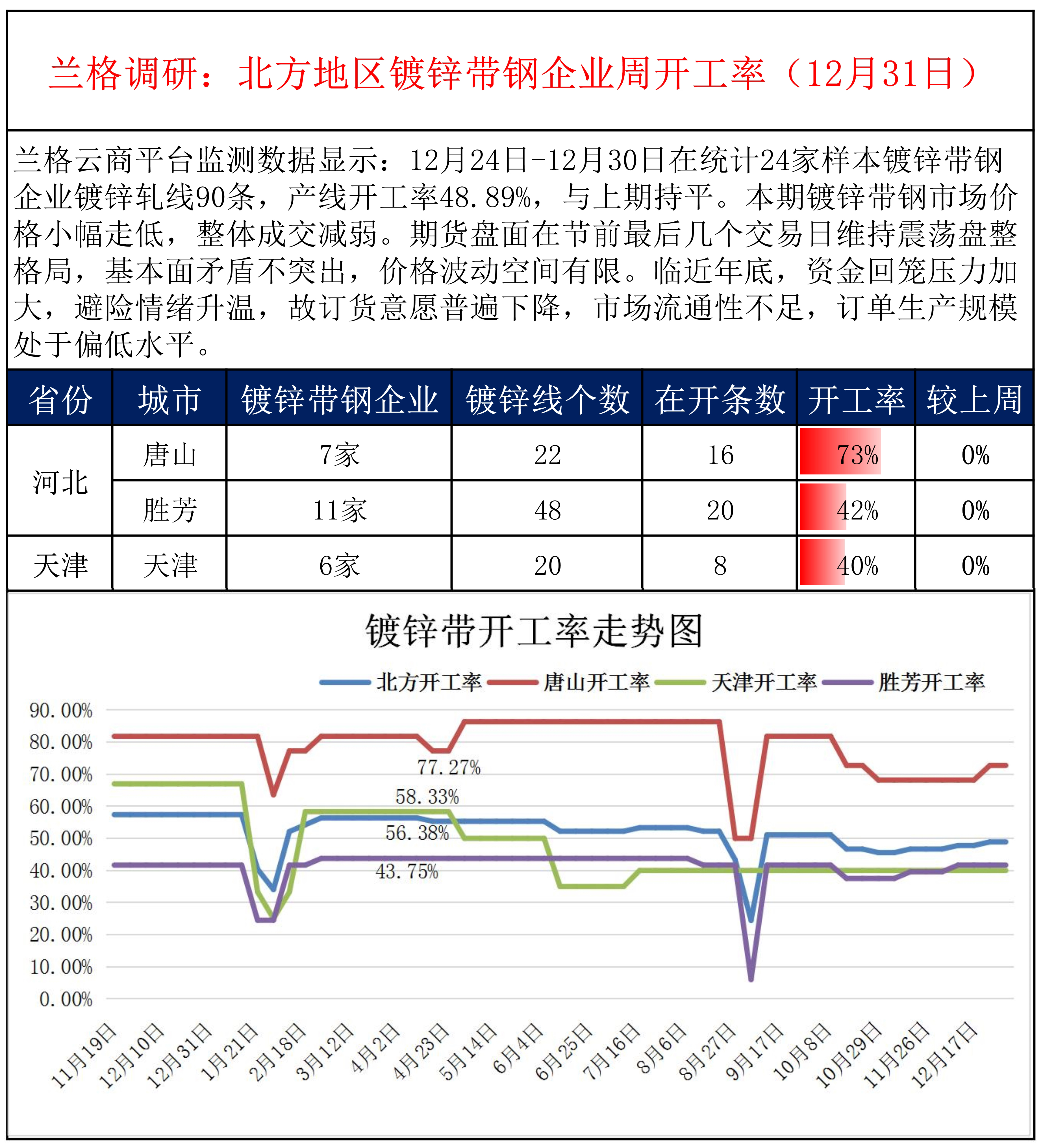• 兰格调研:北方地区镀锌带钢企业周开工率(12月31日)