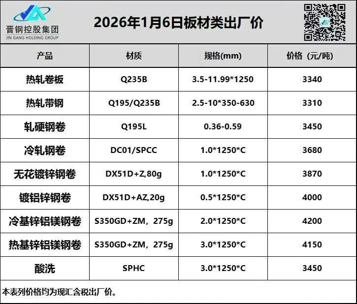 1月6日山西晋钢板材类出厂价格