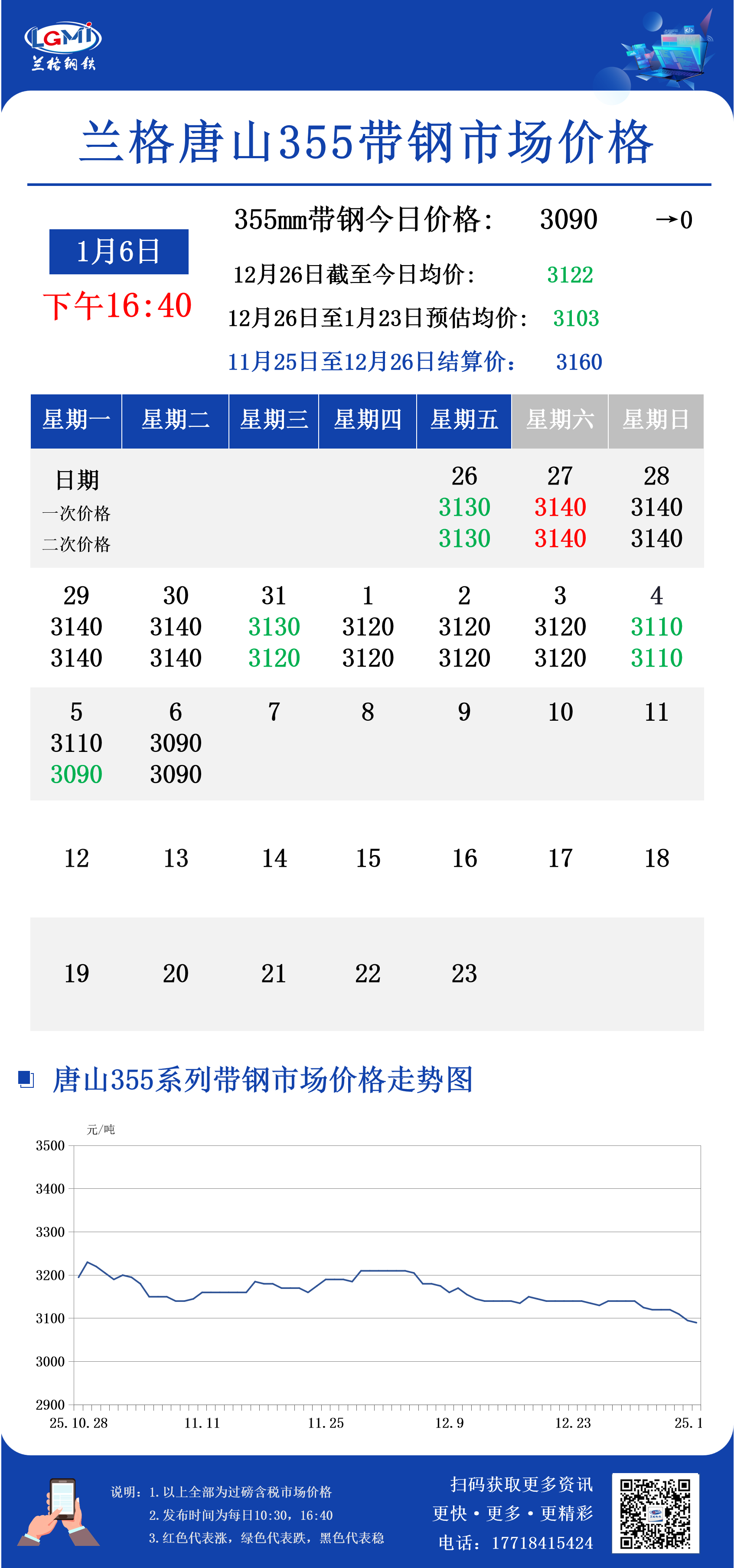 兰格钢铁云商平台监测数据显示,截至1月6日16:40,唐山地区355系列带钢市场价格为3090元,较昨日市场收盘价格稳。