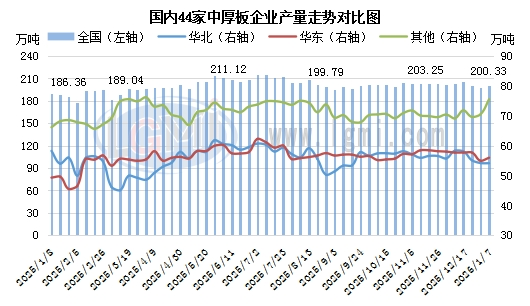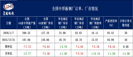 2026年1月7日,兰格钢铁网监测的中厚板钢厂主要指标显示,本周全国中厚板总产量环比小幅回升,钢厂库存水平由降转增,具体来看,元旦假期过后,部分前期检修企业陆续恢复产能,同时,个别地区主导钢厂为满足现阶段部分终端行业的备货需求,适当提高了生产节奏,因此样本钢厂总产量处于增长区间。至于库存方面,下游市场需求经历了节前需求释放后,采购节奏有所放缓,尤其是华东、华南等南方市场,钢厂出货速度不及预期,使得厂内库存量出现明显增长的情况,而华北地区因个别重点项目工程仍有追赶工期的需求,市场采购活跃度尚可,短期内钢厂库存压力相对较小。