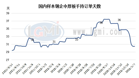 1月7日,本周国内钢企手持订单呈现下降趋势,总体表现为良:一线企业手持订单天数保持在30-90天左右,二线企业基本保持在25-35天。从近期钢厂排产计划来看,随着市场需求进一步走弱,各地钢厂除长协订单量外,市场现货订单承接量呈现下滑态势,整体手持订单天数较前期略有缩短,市场观望情绪浓厚。