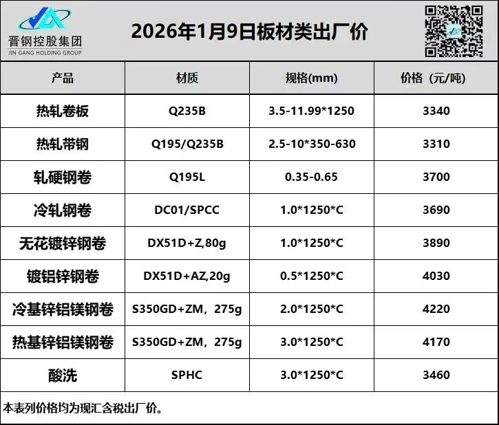 1月9日山西晋钢板材类出厂价格