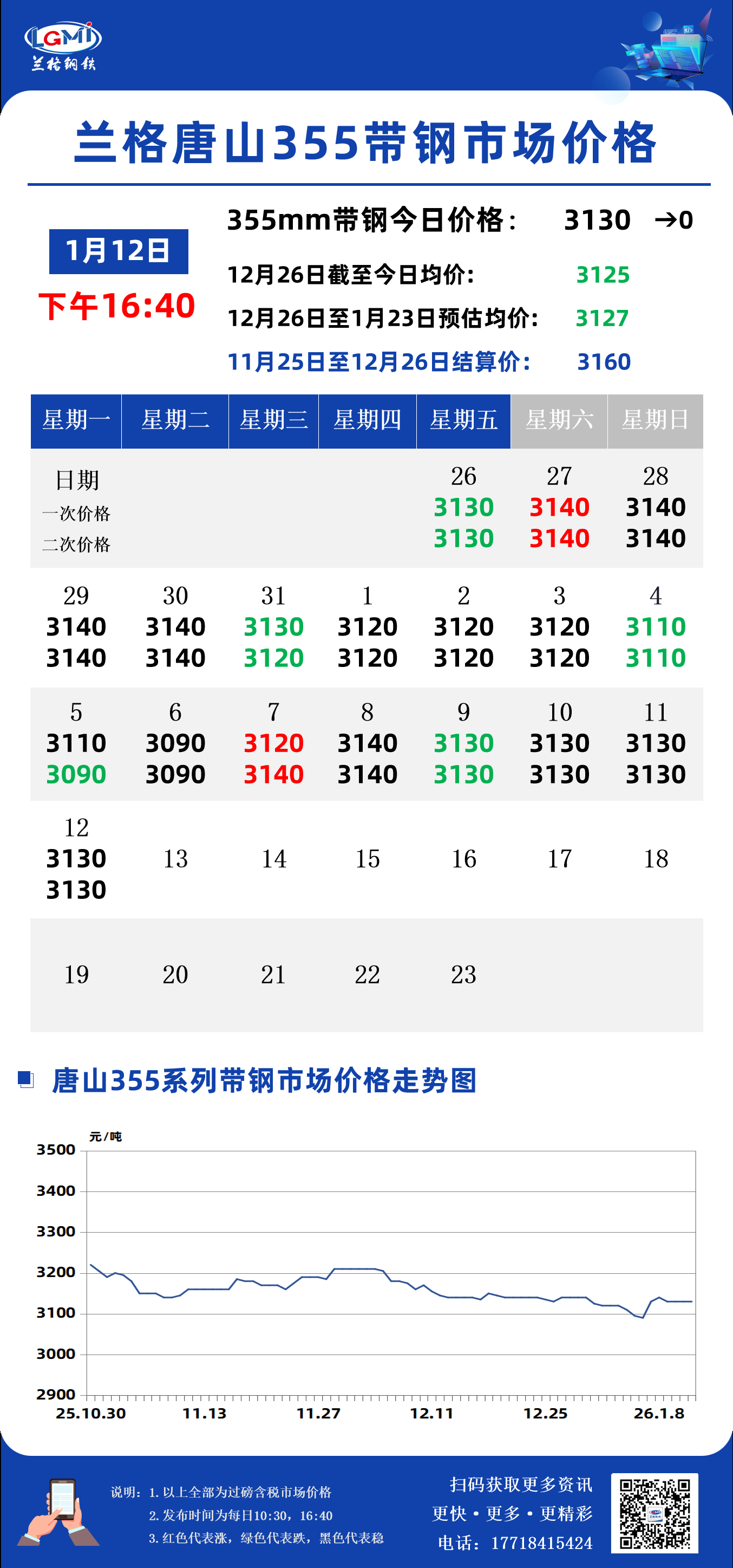兰格钢铁云商平台监测数据显示,截至1月12日16:40,唐山地区355系列带钢市场价格为3130元,较昨日市场收盘价格持平。