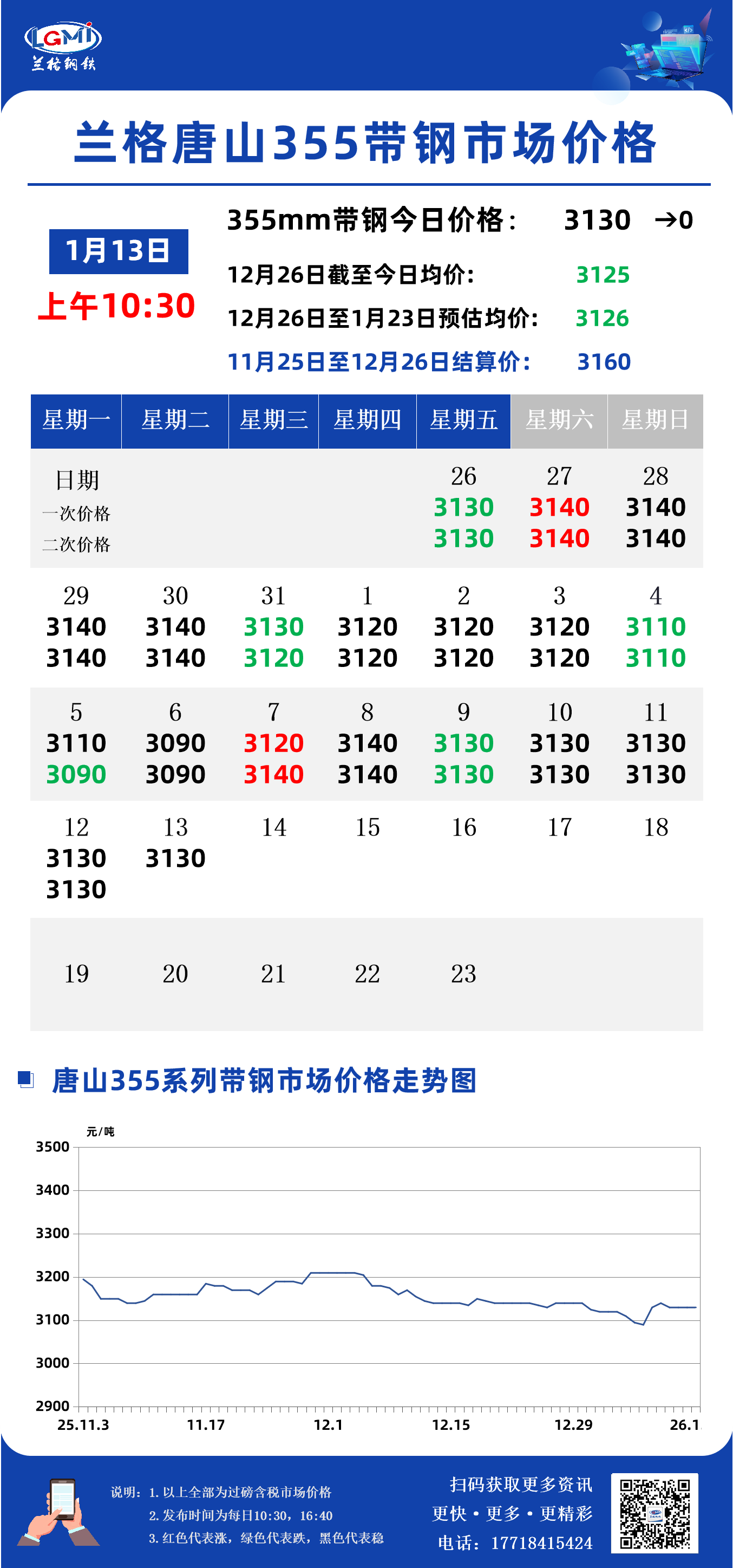 据兰格钢铁云商平台监测数据显示,截至1月13日10:30,唐山地区355系列带钢市场价格为3130元,较昨日市场收盘价格稳。