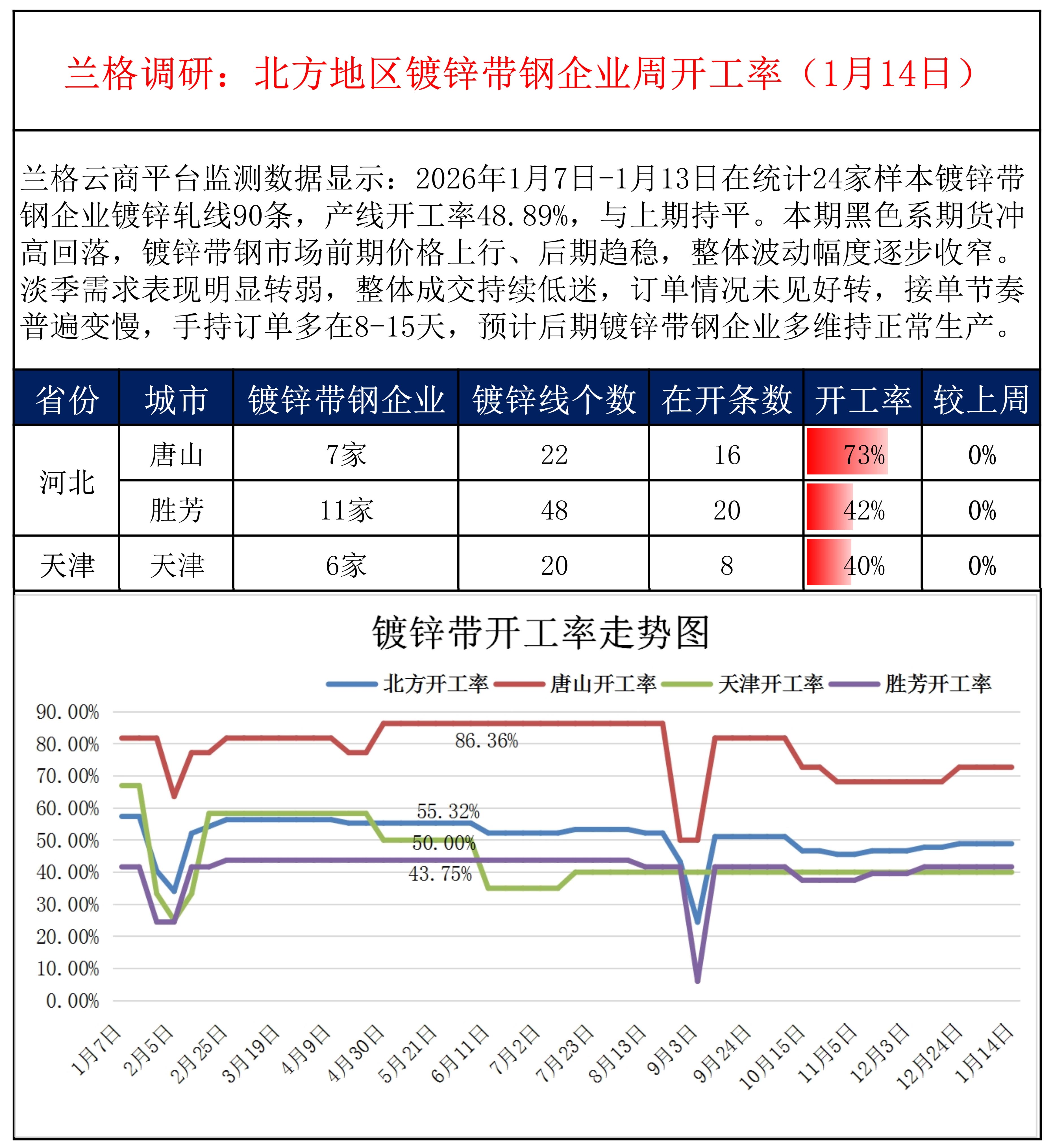 • 兰格调研:北方地区镀锌带钢企业周开工率(1月14日)
