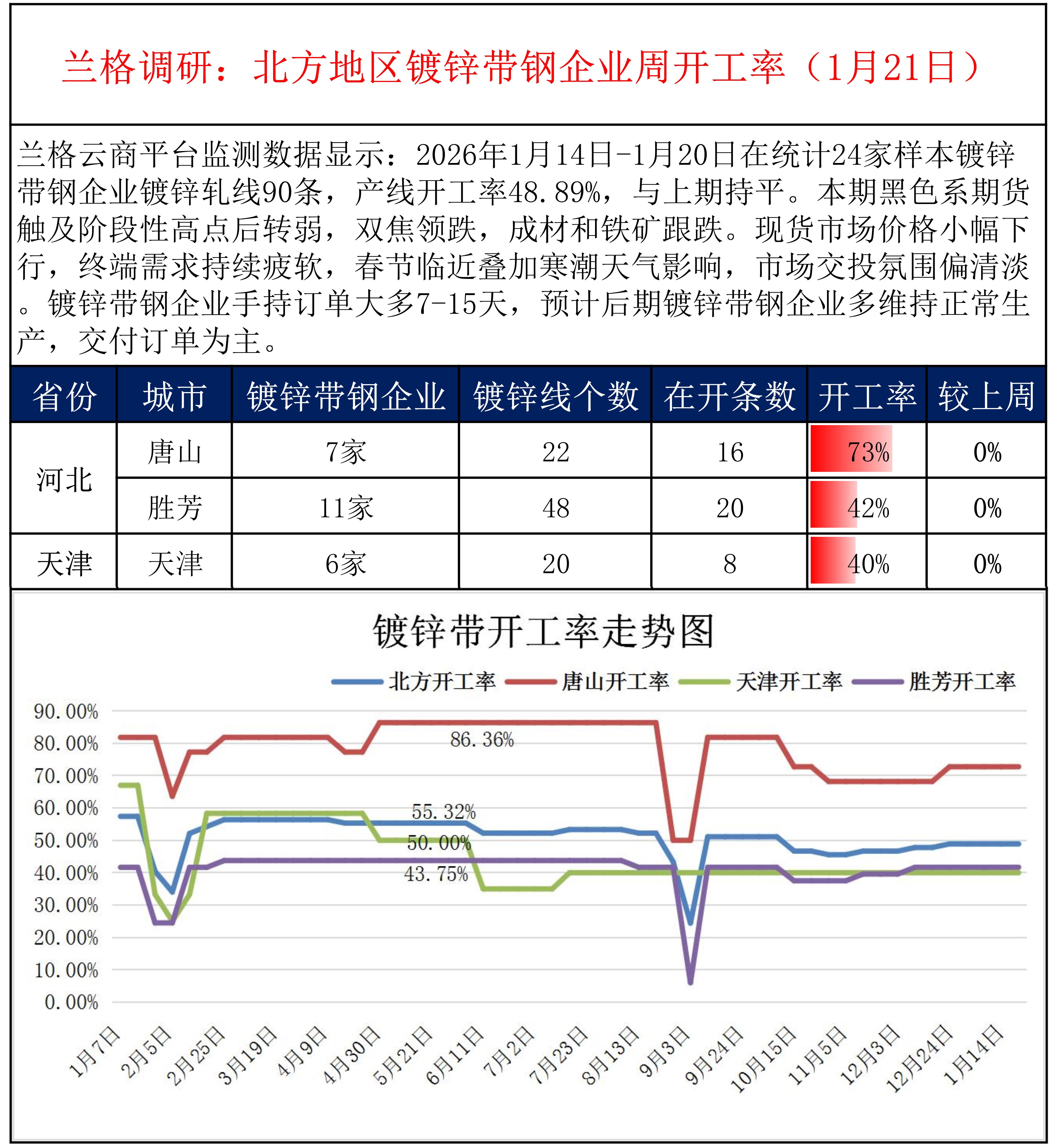 • 兰格调研:北方地区镀锌带钢企业周开工率(1月21日)