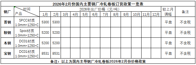 2026年2月份国内主要钢厂冷轧板卷订货政策