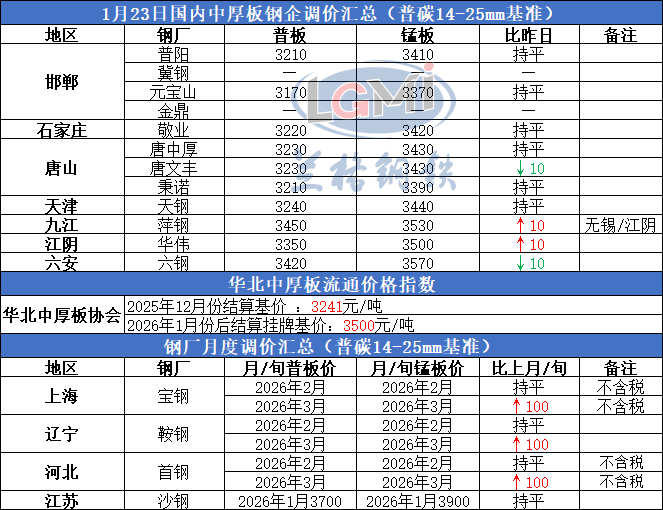 • 2026年1月23日国内中厚板钢企调价汇总