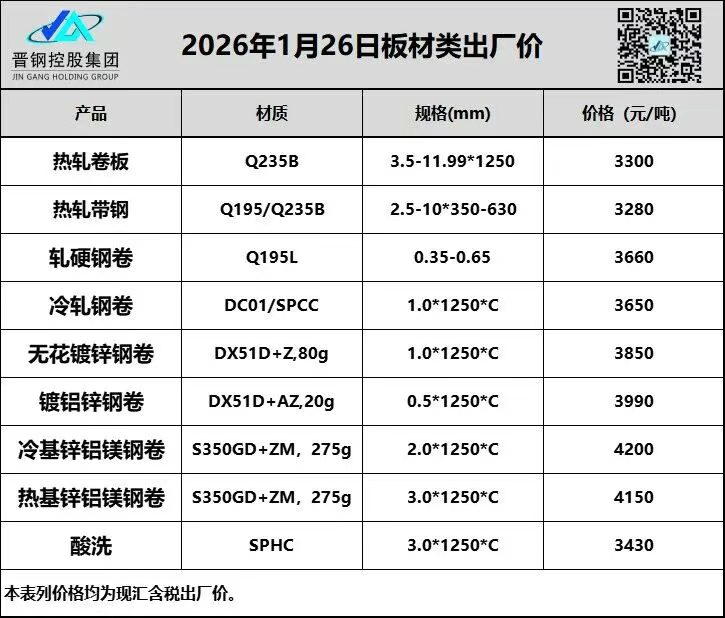 1月26日山西晋钢板材类出厂价格