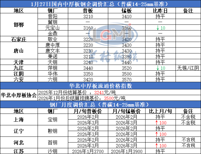 • 2026年1月27日国内中厚板钢企调价汇总