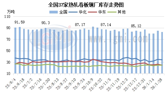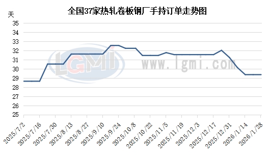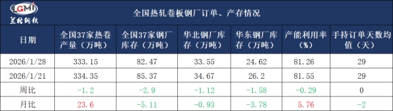 截止1月28日,兰格钢铁网监测的全国热卷钢厂主要指标显示,国内热卷总产量小幅下降,钢厂厂内库存压力略有缓解。追踪国内37家热卷企业本周热卷总产量约333.15万吨,较上周同期减少1.2万吨;热卷轧线产能利用率81.26%,下降0.29个百分点;样本钢厂库存量约为82.47万吨,较上周下降2.9万吨。 目前手持订单情况总体表现为良,长协订单29天,较上周稳定:一线企业手持订单天数保持在30天左右,二线企业基本保持在15-25天。(指标评价-良)。 注:评价指标,仅代表兰格根据关联指标给出的市场晴雨表推荐参考,分优、良、一般、低,四个档位。
