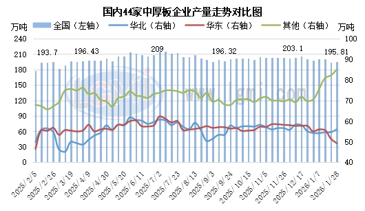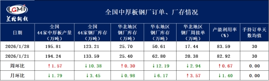2026年1月28日,兰格钢铁网监测的中厚板钢厂主要指标显示,本周全国中厚板产量有所增加,钢厂库存大幅减少。具体来看,随着年节临近,部分钢企开始进入检修阶段,华东区域近期检修轧线较为集中,产量有所降低,但其他区域部分钢企产量略有提升,故整体产量表现小幅增加之势,据市场反馈,目前钢企对品种钢生产较多,流通材产量缩减明显,部分业者表示近期市场普板和低合金资源有所减少;而库存方面,由于正处于结算周期交替阶段,钢企新规定有随着结算周期库存清零操作,以备新资源入库,故近几日库存量相对较低,总库存大幅缩减主因在此,其他变化相对较小。