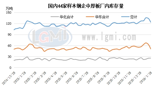 1月28日,全国中厚板44家样本钢厂库存总量为123.21万吨,环比上周同期减少10.38万吨,其中华北12家钢企中厚板厂库为25.7万吨,环比上期增加0.3万吨;华东12家钢企中厚板厂库为50.61万吨,环比上周同期下降12.19万吨。从数据反馈来看,本周北方市场需求仍显偏低,钢企库存量有小幅增加,目前随着年节临近,部分贸易企业采购需求减弱,消耗库存为主,而华东区域钢企库存大幅降低,主要在于部分钢企结算周期节点刚过,协议资源和锁单资源基本清算完毕,而新的资源产出相对一般,钢企库存量表现大幅,该变化值与市场需求关联度不大,华东区域中厚板市场部分终端虽有补货,但基本在正常体量。