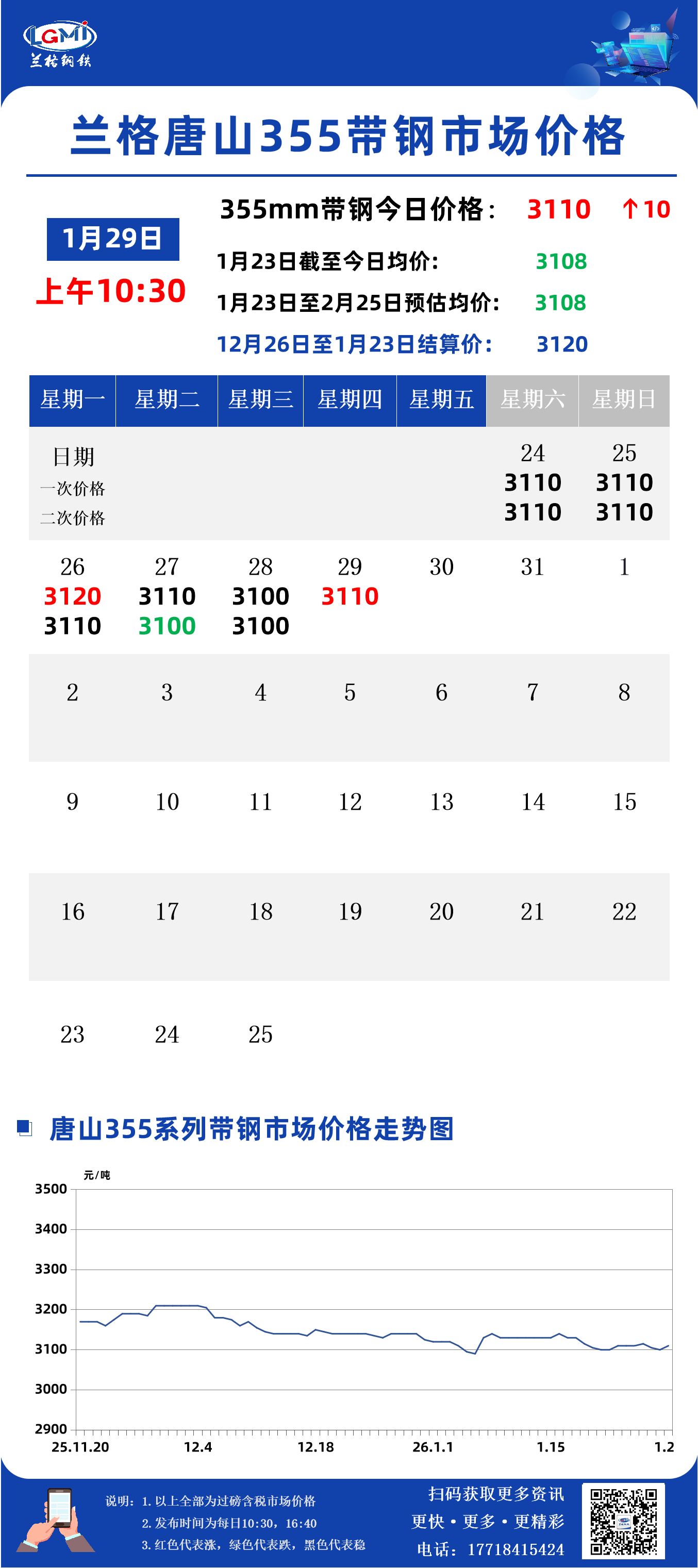 据兰格钢铁云商平台监测数据显示,截至1月29日10:30,唐山地区355系列带钢市场价格为3110元,较昨日市场收盘价格涨10元。