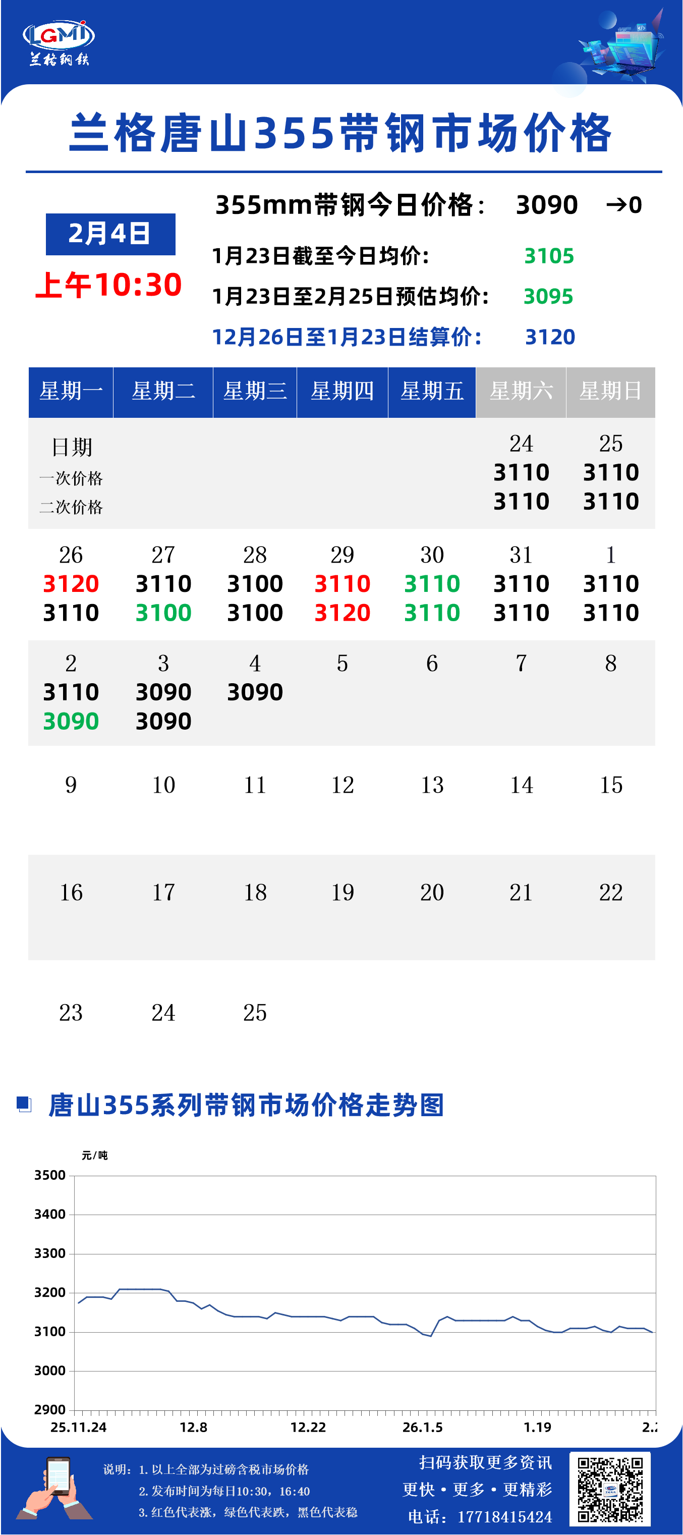 兰格钢铁云商平台监测数据显示,截至2月4日10:30,唐山地区355系列带钢市场价格为3090元,较昨日市场收盘价格稳。