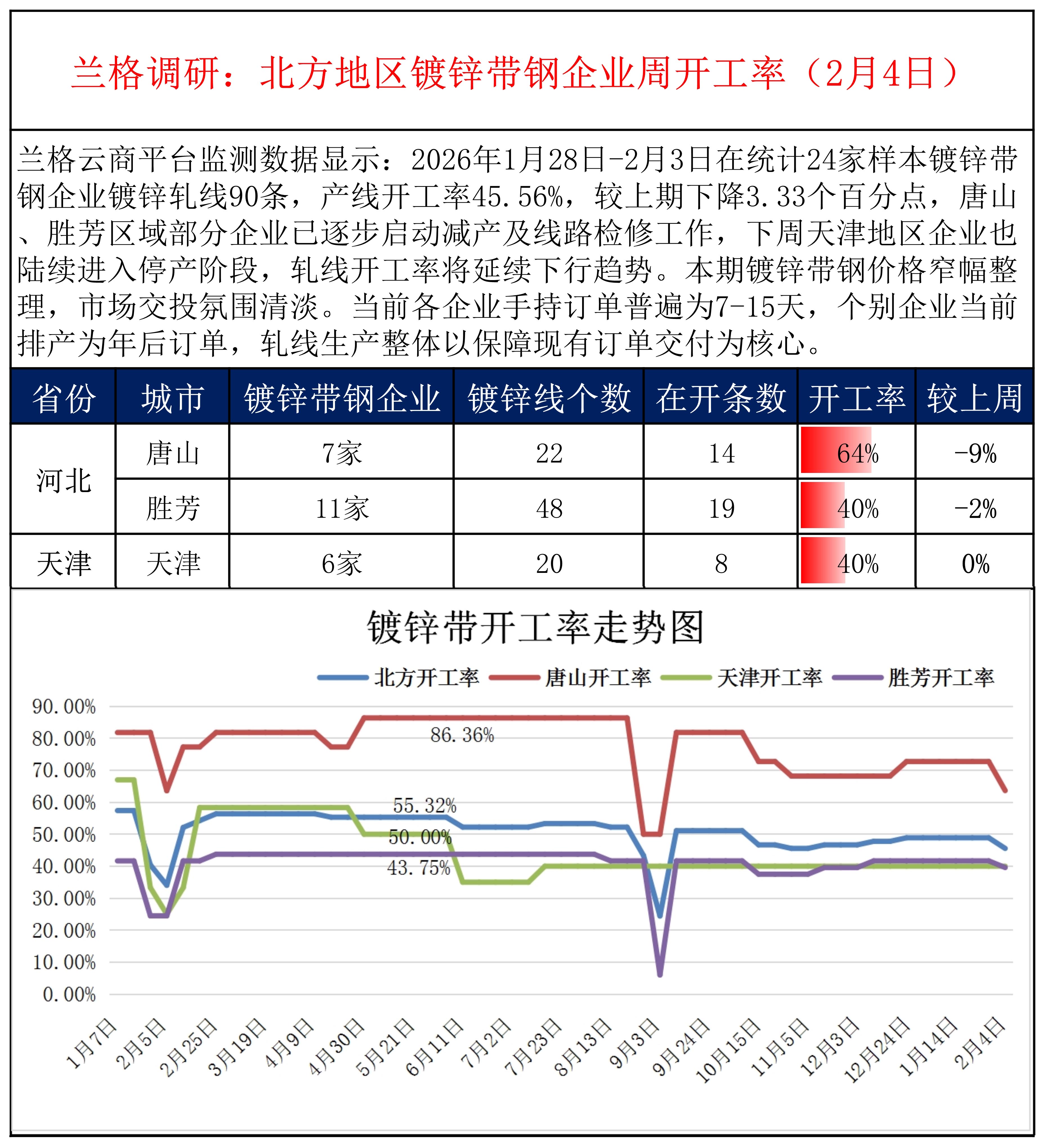 • 兰格调研:北方地区镀锌带钢企业周开工率(2月4日)
