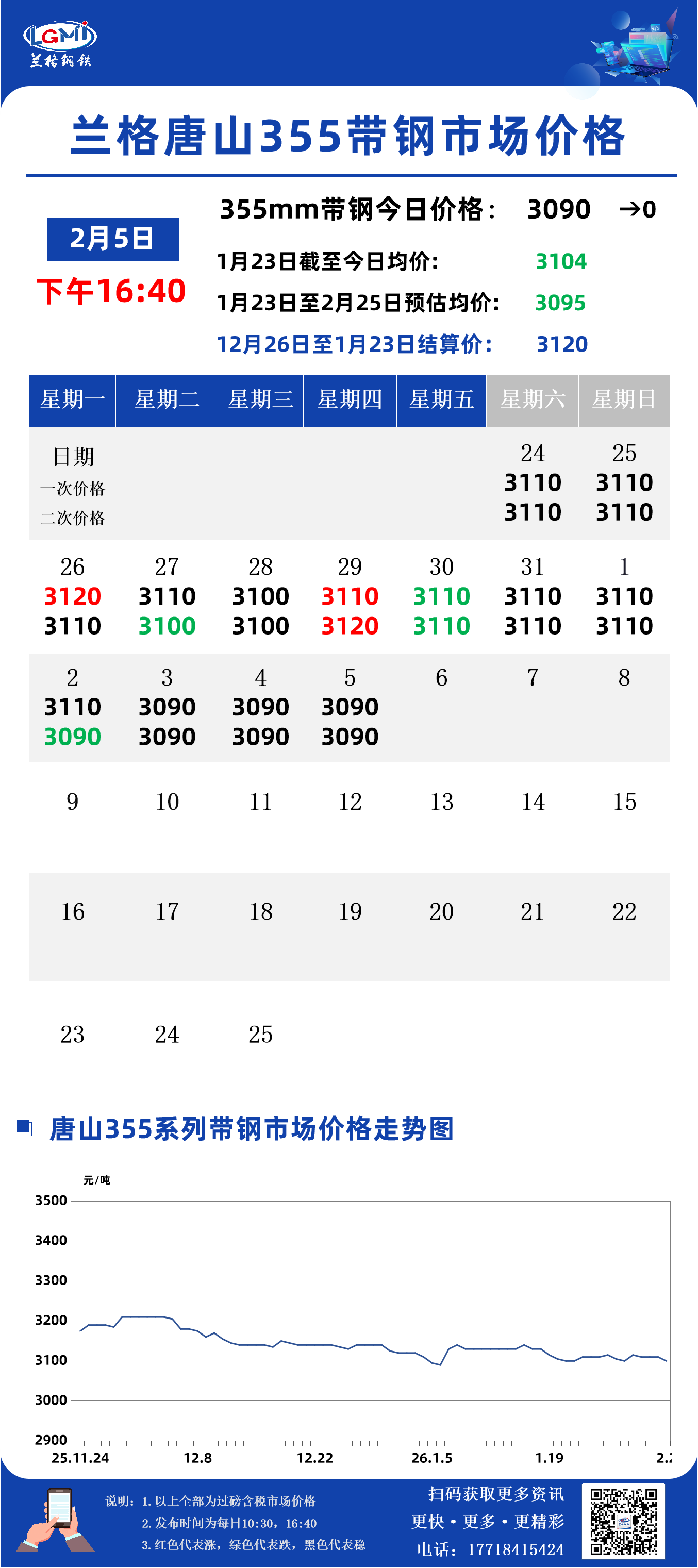 兰格钢铁云商平台监测数据显示,截至2月5日16:40,唐山地区355系列带钢市场价格为3090元,较昨日市场收盘价格稳。