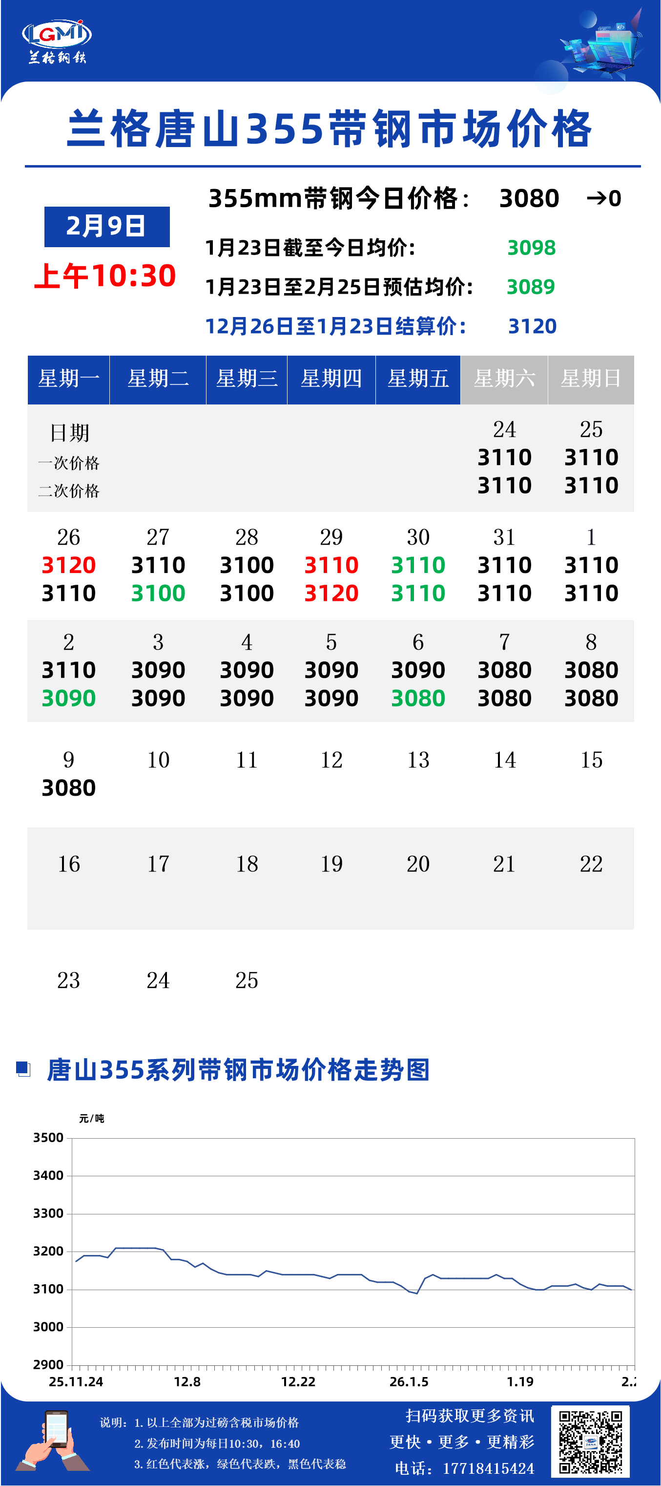 兰格钢铁云商平台监测数据显示,截至2月9日10:30,唐山地区355系列带钢市场价格为3080元,较昨日市场收盘价格稳。