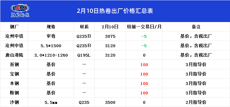 • 2月10日热卷出厂价格汇总