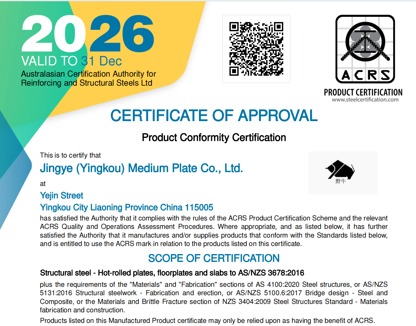 近日,敬业营口中板成功通过澳大利亚与新西兰认证机构ACRS(Australasian Certification Authority for Reinforcing Steels)的严格审核,正式获得其权威产品认证,标志着营口中板高端制造体系、全流程质量管控及产品核心性能与国际高标准实现全面接轨,中厚板产品拥有了直通澳大利亚、新西兰及诸多国际高端基建市场的金牌通行证。